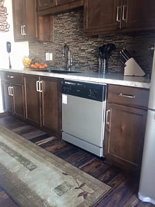 This residential remodeling project updated the original 1970s kitchen cabinets with a modern custom design using Rustic Alder wood stained with Mission Oak stain. The original island was replaced by a fashionable island with a raised snack bar, which is made more functional by including a cook top built into it.
